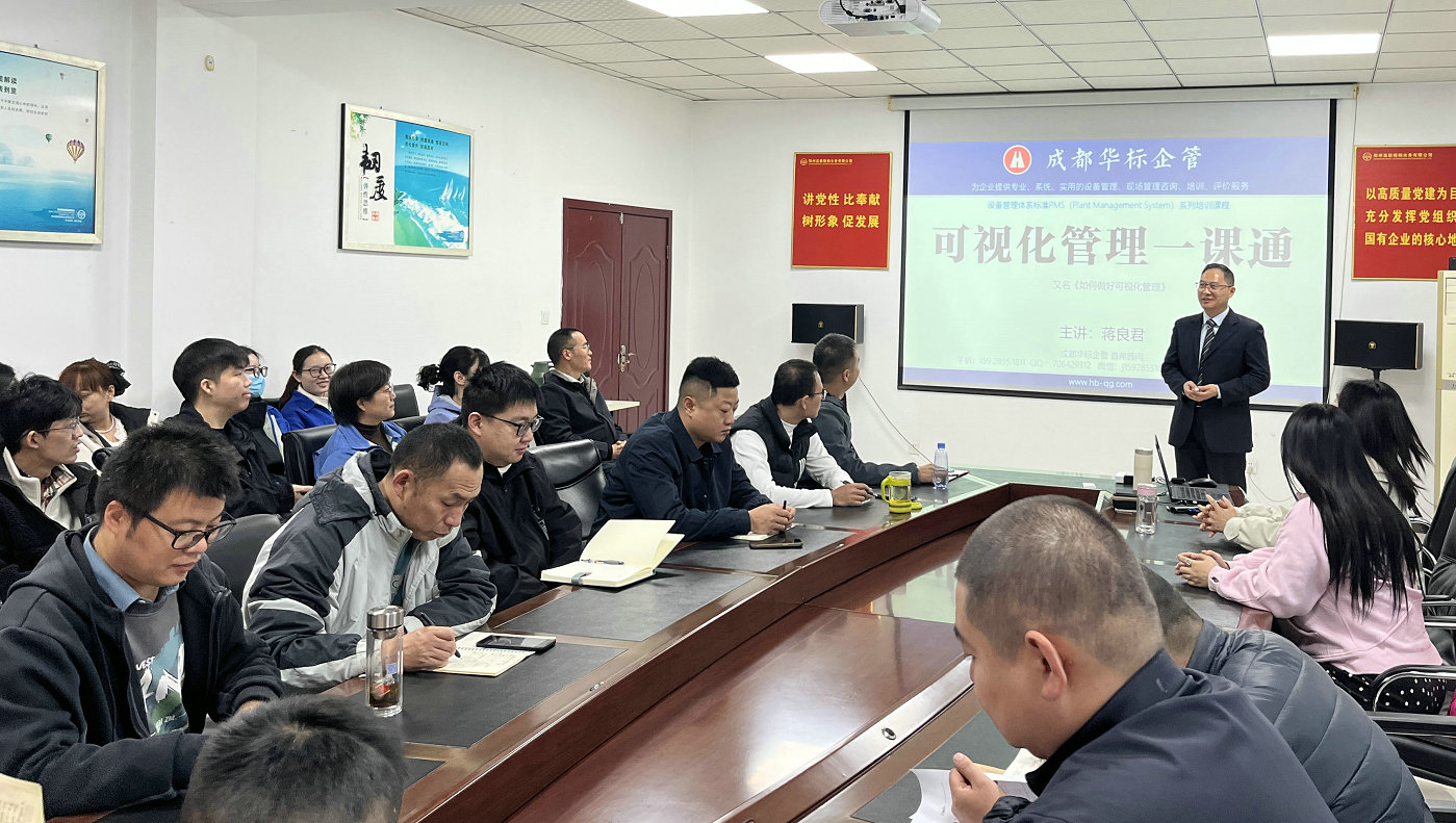 成都华标企管首席顾问蒋良君于11月3日指导推进办建立了项目推进组织机构和推进管理办法,并按项目计划,于11月4日、5日上午,分别培训了《可视化管理一课通》(图5)《如何做好6S管理》《如何编制设备操作规程》《如何开展清除6源活动》《如何开展OPL活动》,提供后续两个月开展具体工作所需的制度草案、技术标准模板等资料给推进办。